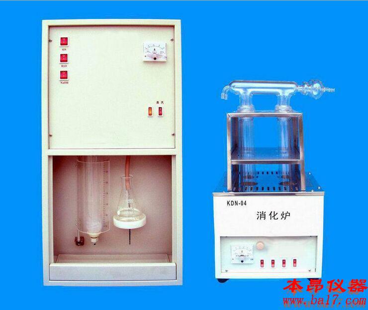 ??? KDN-04B型定氮儀整套裝置,由電加熱消化爐和蒸餾器兩大部分組成。KDN-04B型定氮儀消化爐,由于采用井式電加熱爐,增大了消化管受熱面,使消化管連同管內(nèi)所注入的10mlH2SO4及試樣插入井式爐內(nèi)加熱取得了較佳的熱效應(yīng),大大縮短了消化時(shí)間,消化管內(nèi)逸出的SO2等有害氣體,通過消化爐上的排污管經(jīng)抽吸泵從水中排入下水道,有效地抑制有害氣體的外逸,省略了實(shí)驗(yàn)室中安裝毒氣通風(fēng)櫥,試樣經(jīng)40分鐘左右消化煮解,即能完全消化盡。